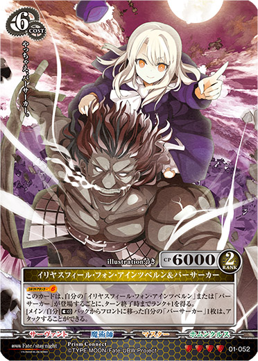 - [コネクトアタック(6)]このカードは、自分の「イリヤスフィール・フォン・アインツベルン」または「バーサーカー」が登場するごとに、ターン終了時までランク+1を得る。[メイン/自分](宣)バックからフロントに移った自分の「バーサーカー」1枚は、アタックすることができる。