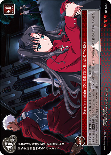 - [メイン/自分](宣)自分のキャラ1枚は、ターン終了時までCP+1000を得る。[メイン/自分](宣)手札にある「Fate/stay night UNLIMITED BLADE WORKS」1枚を捨て札にする。その場合、デッキの上のカード1枚を表向きでコネクトゲージに移す。