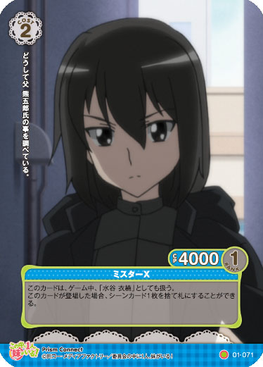このカードは、ゲーム中、「水谷 衣楠」としても扱う。このカードが登場した場合、シーンカード1枚を捨て札にすることができる。