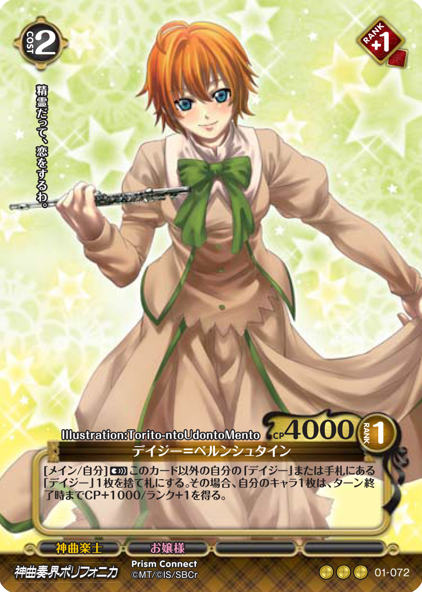 [メイン/自分](宣)このカード以外の自分の「デイジー」または手札にある「デイジー」1枚を捨て札にする。その場合、自分のキャラ1枚は、ターン終了時までCP+1000/ランク+1を得る。