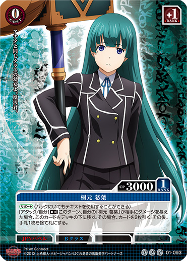 [サポート](バックにいてもテキストを使用することができる)[アタック/自分](宣)このターン、自分の「桐元 葛葉」が相手にダメージを与えた場合、このカードをデッキの下に移す。その場合、カードを2枚引く。その後、手札1枚を捨て札にする。