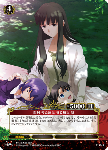 このカードが登場した場合、デッキの上のカード7枚を見て、その中にある「間桐 桜」または「遠坂 凛」1枚を抜き出し、表にしてから手札に加える。その後、デッキをシャッフルする。