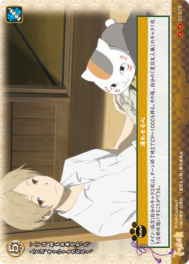 [メイン/両方]自分のキャラ2枚は、ターン終了時までCP+1000を得る。その後、自分の『夏目友人帳』のキャラ1枚を活動状態にすることができる。