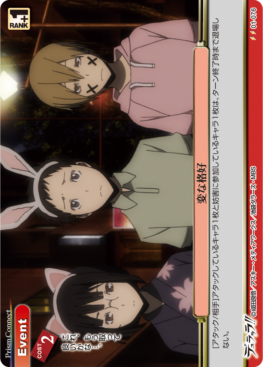 [アタック/相手]:アタックしているキャラ1枚と妨害に参加しているキャラ1枚は、ターン終了時まで退場しない。