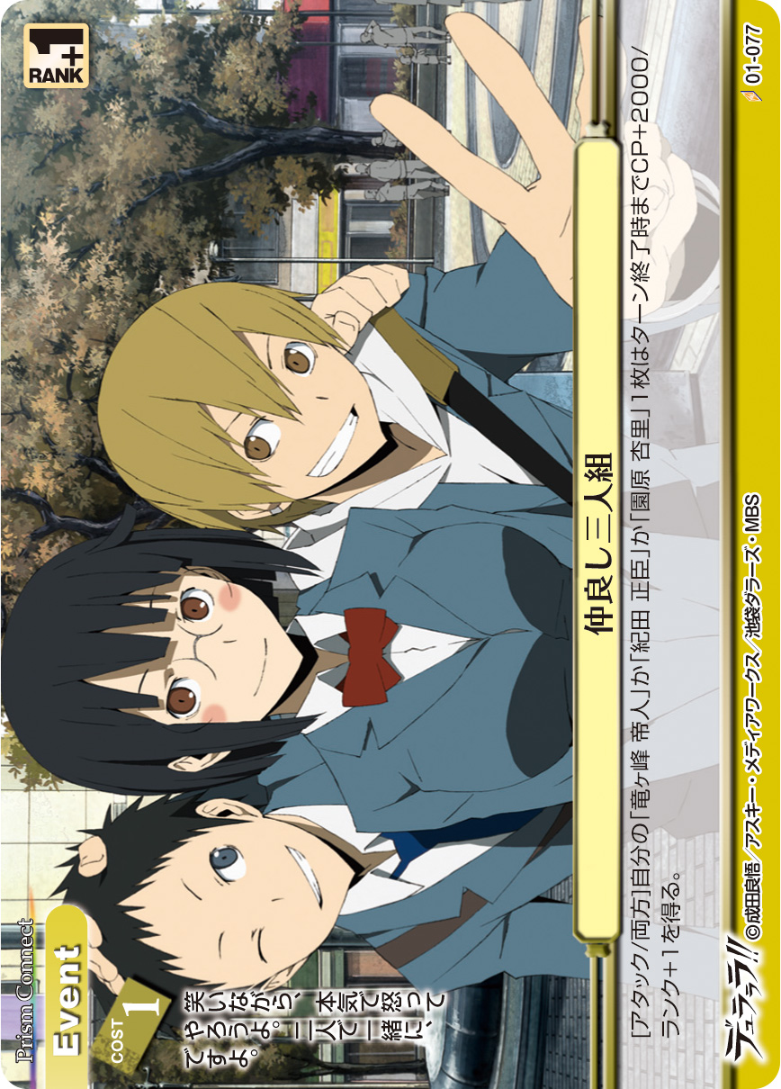 [アタック/両方]:自分の「竜ヶ峰 帝人」か「紀田 正臣」か「園原 杏里」1枚はターン終了時までCP+2000/ランク+1を得る。