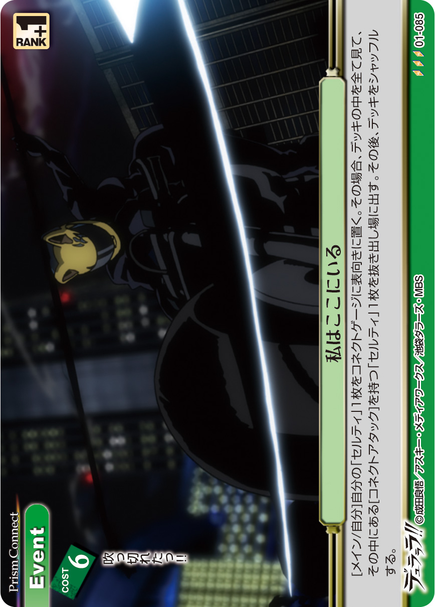 [メイン/自分]:自分の「セルティ」1枚をコネクトゲージに表向きに置く。その場合、デッキの中を全て見て、その中にある[コネクトアタック]を持つ「セルティ」1枚を抜き出し場に出す。その後、デッキをシャッフルする。
