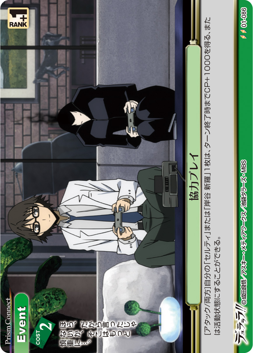 [アタック/両方]:自分の「セルティ」または「岸谷 新羅」1枚は、ターン終了時までCP+1000を得る、または活動状態にすることができる。