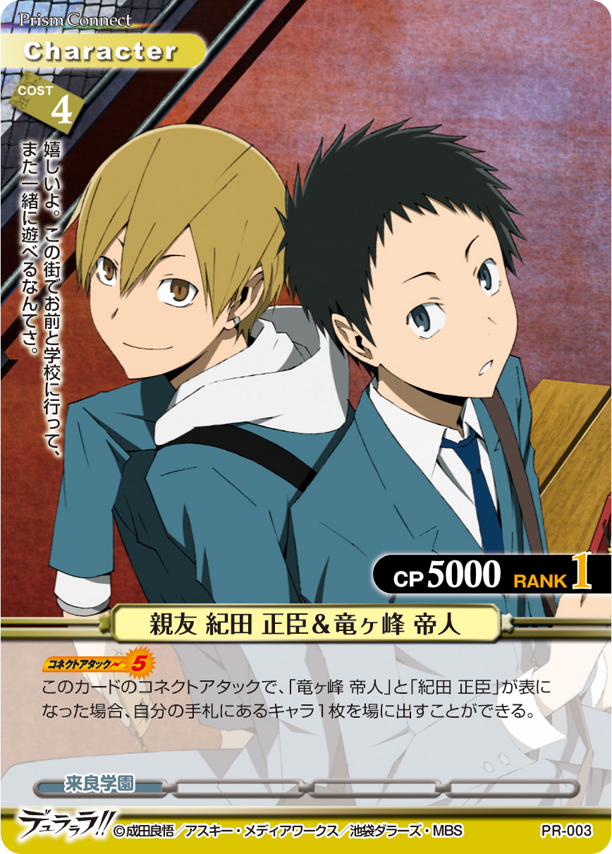 [コネクトアタック(5)]このカードのコネクトアタックで、「竜ヶ峰 帝人」と「紀田 正臣」が表になった場合、自分の手札にあるキャラ1枚を場に出すことができる。
