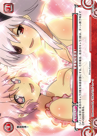 [メイン/自分]自分のキャラ2枚を休息状態にする。その場合、自分のキャラ1枚は、ターン終了時までCP+5000を得る。