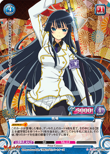 [コネクトアタック(4)]このカードが登場した場合、デッキの上のカード4枚を見て、その中にある【国立半蔵学院】を持つキャラ1枚を抜き出し、表にしてから手札に加える。その後、残りのカードを任意の順番でデッキの下に移す。