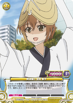 このカードが登場した場合、自分の「加賀 香子」1枚は、ターン終了時までCP+1000/ランク+1を得る。このターン、そのキャラのアタックで、相手にダメージを与えた場合、カードを1枚引く。
