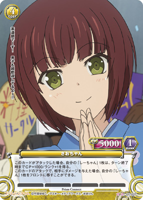 このカードがアタックした場合、自分の「しーちゃん」1枚は、ターン終了時までCP+1000/ランク+1を得る。このカードのアタックで、相手にダメージを与えた場合、自分の「しーちゃん」1枚をフロントに移すことができる。