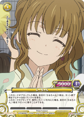 このカードがアタックした場合、自分の「さおちゃん」1枚は、ターン終了時までCP+1000/ランク+1を得る。このカードのアタックで、相手にダメージを与えた場合、自分の「さおちゃん」1枚をフロントに移すことができる。