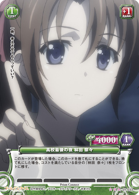 このカードが登場した場合、このカードを捨て札にすることができる。捨て札にした場合、コストを満たしている自分の「林田 奈々」1枚をフロントに移す。