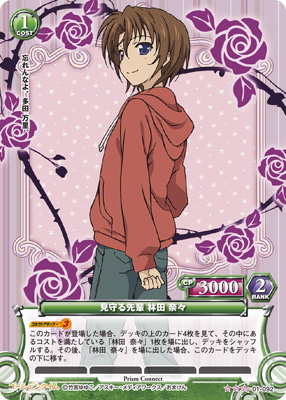 [コネクトアタック(3)]このカードが登場した場合、デッキの上のカード4枚を見て、その中にあるコストを満たしている「林田 奈々」1枚を場に出し、デッキをシャッフルする。その後、「林田 奈々」を場に出した場合、このカードをデッキの下に移す。