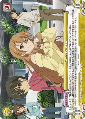 [メイン/自分](宣)自分の『ゴールデンタイム』のキャラ1枚は、ターン終了時までCP+1000を得る。[メイン/自分](宣)手札から「ゴールデンタイム」1枚を捨て札にする。その場合、デッキの中を全て見て、その中にある『ゴールデンタイム』のキャラ1枚を抜き出し、表にしてから手札に加える。その後、デッキをシャッフルする。