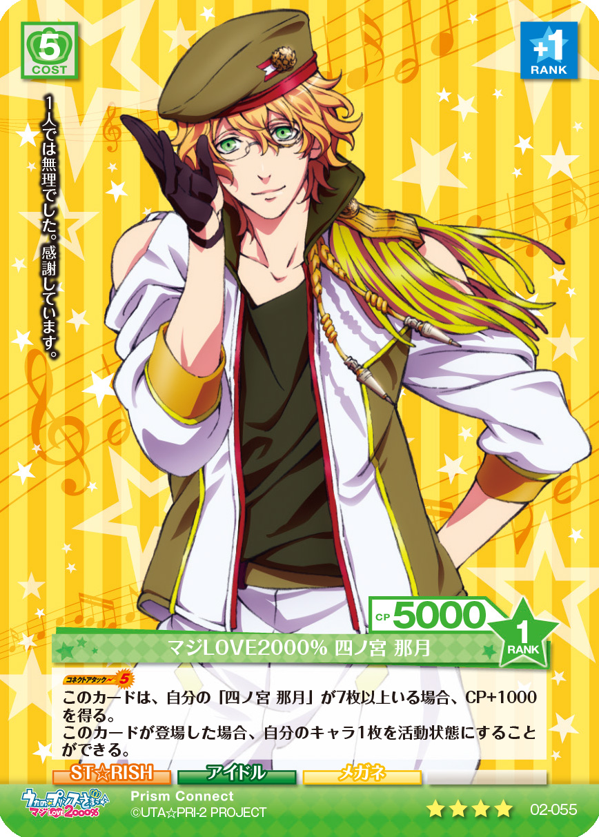 [コネクトアタック(5)]このカードは、自分の「四ノ宮 那月」が7枚以上いる場合、CP+1000を得る。このカードが登場した場合、自分のキャラ1枚を活動状態にすることができる。