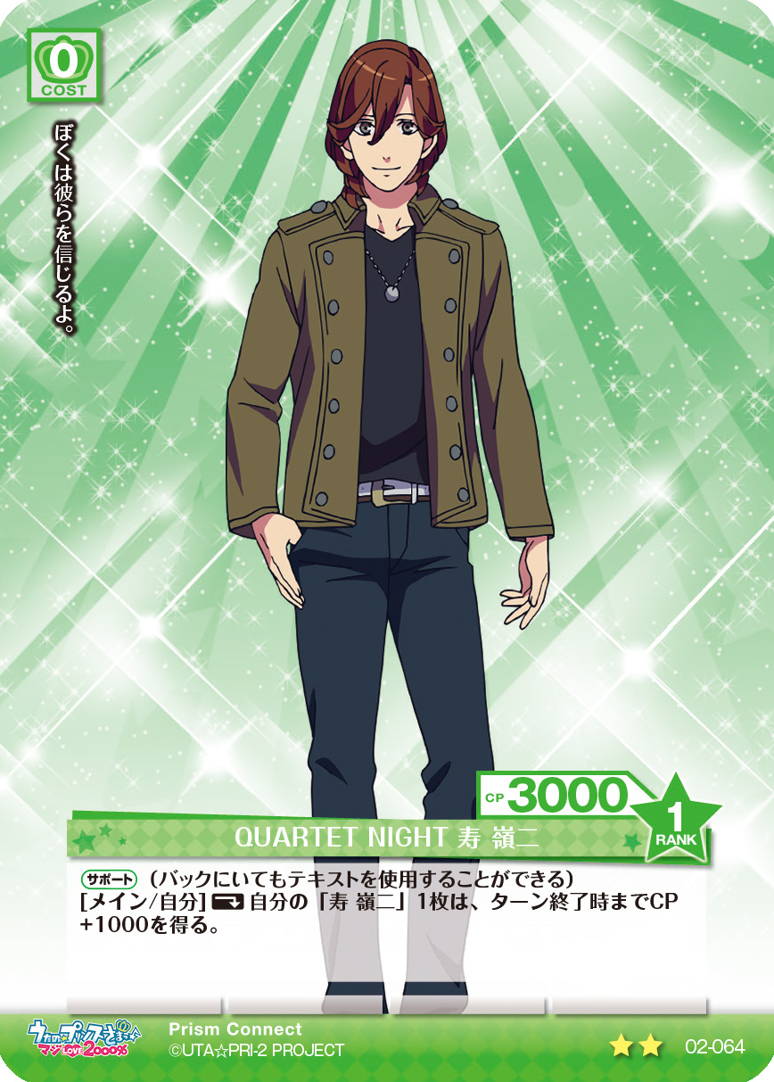 [サポート](バックにいてもテキストを使用することができる)[メイン/自分](休)自分の「寿 嶺二」1枚は、ターン終了時までCP+1000を得る。