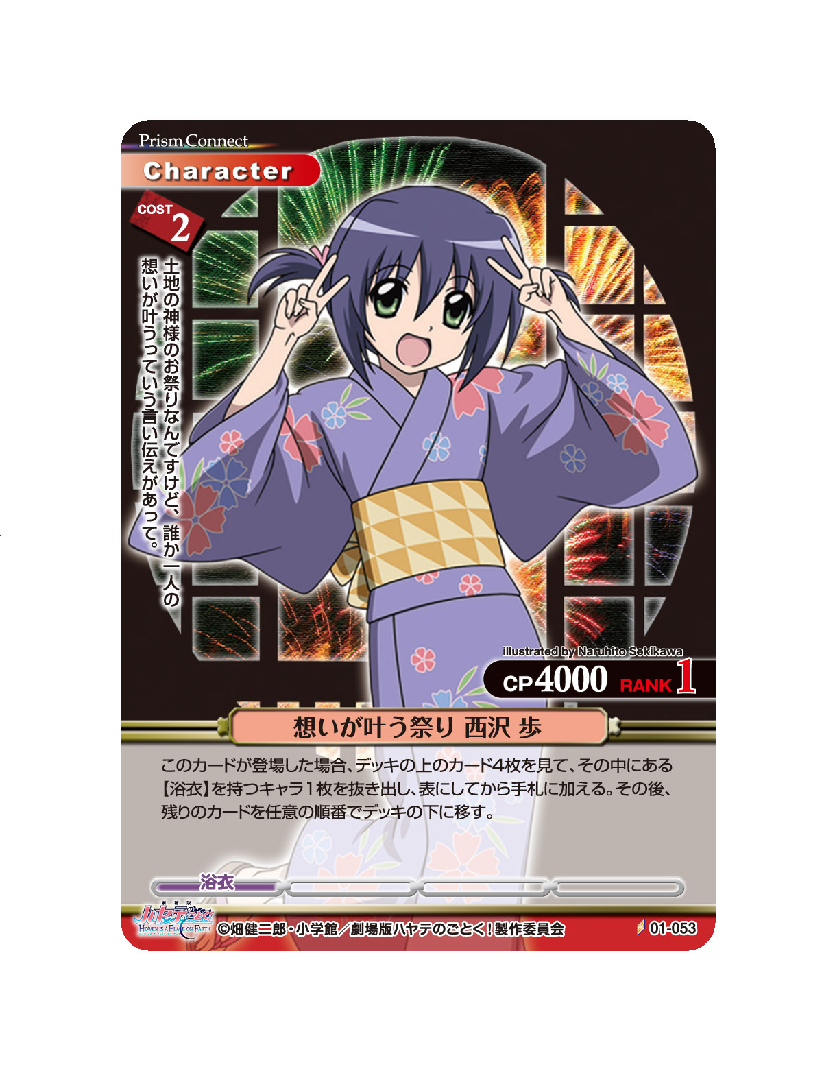 このカードが登場した場合、デッキの上のカード4枚を見て、その中にある【浴衣】を持つキャラ1枚を抜き出し、表にしてから手札に加える。その後、残りのカードを任意の順番でデッキの下に移す。
