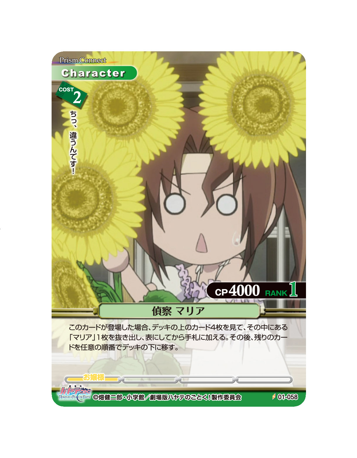このカードが登場した場合、デッキの上のカード4枚を見て、その中にある「マリア」1枚を抜き出し、表にしてから手札に加える。その後、残りのカードを任意の順番でデッキの下に移す。