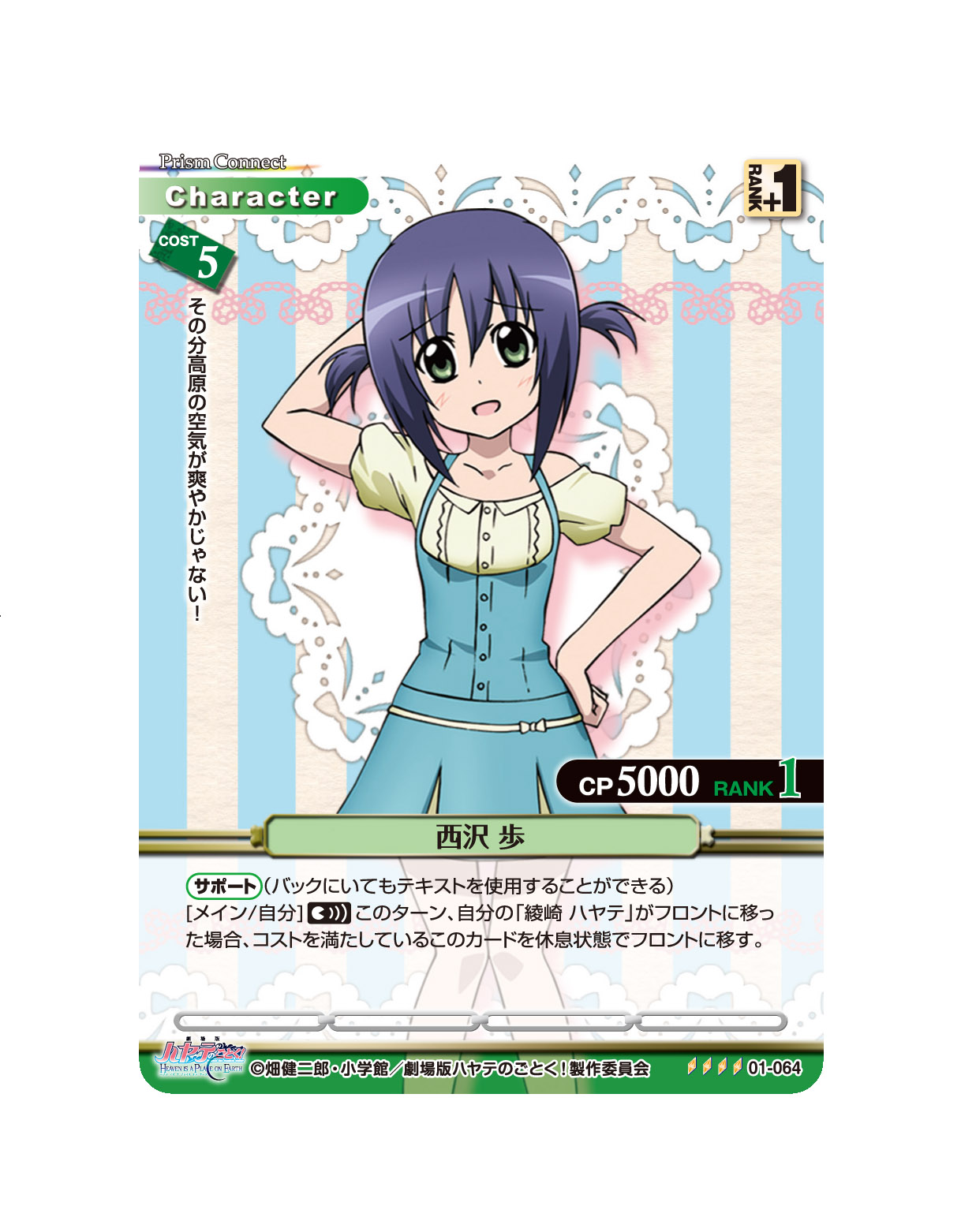 [サポート](バックにいてもテキストを使用することができる)[メイン/自分](宣)このターン、自分の「綾崎 ハヤテ」がフロントに移った場合、コストを満たしているこのカードを休息状態でフロントに移す。