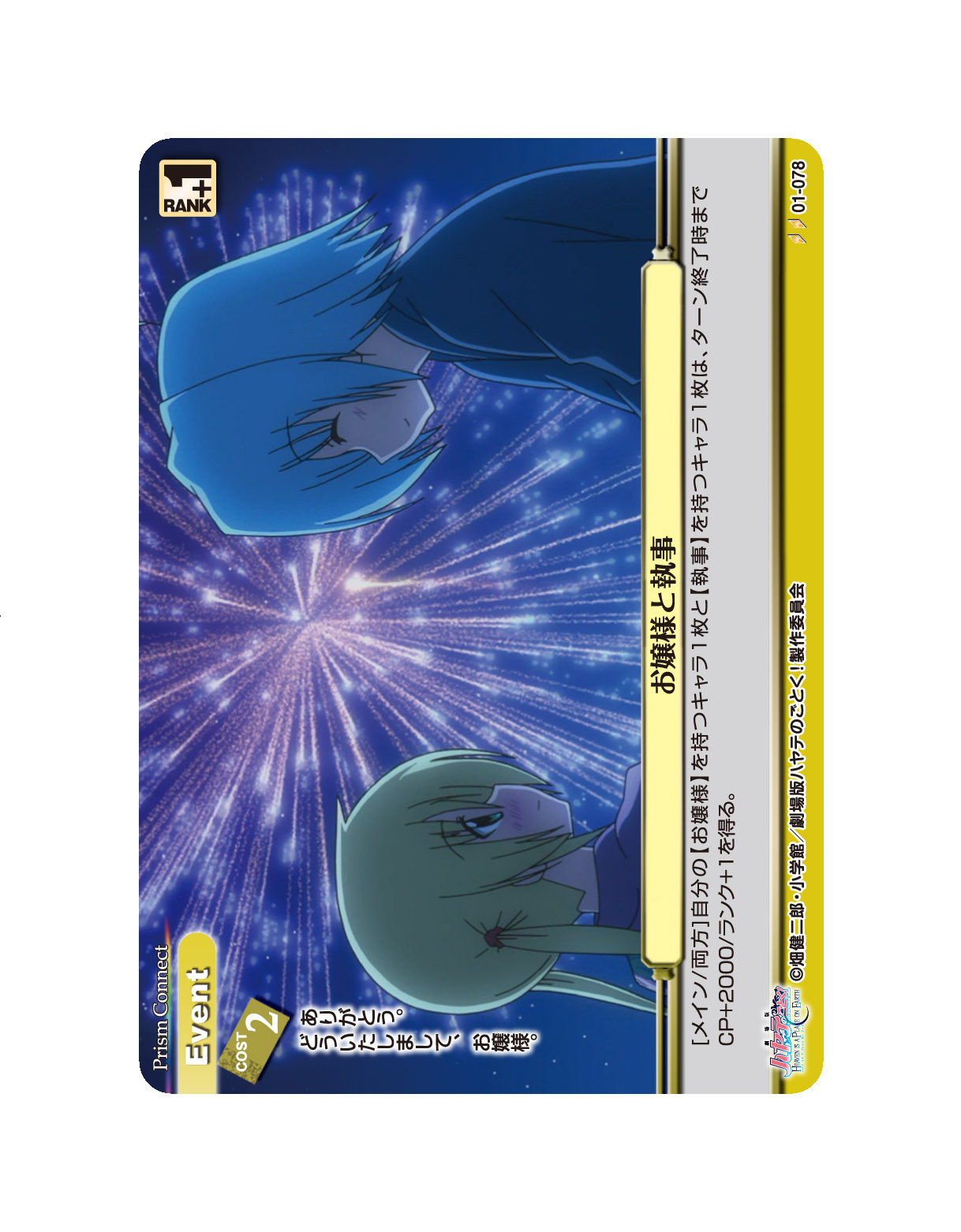 [メイン/両方]自分の【お嬢様】を持つキャラ1枚と【執事】を持つキャラ1枚は、ターン終了時までCP+2000/ランク+1を得る。