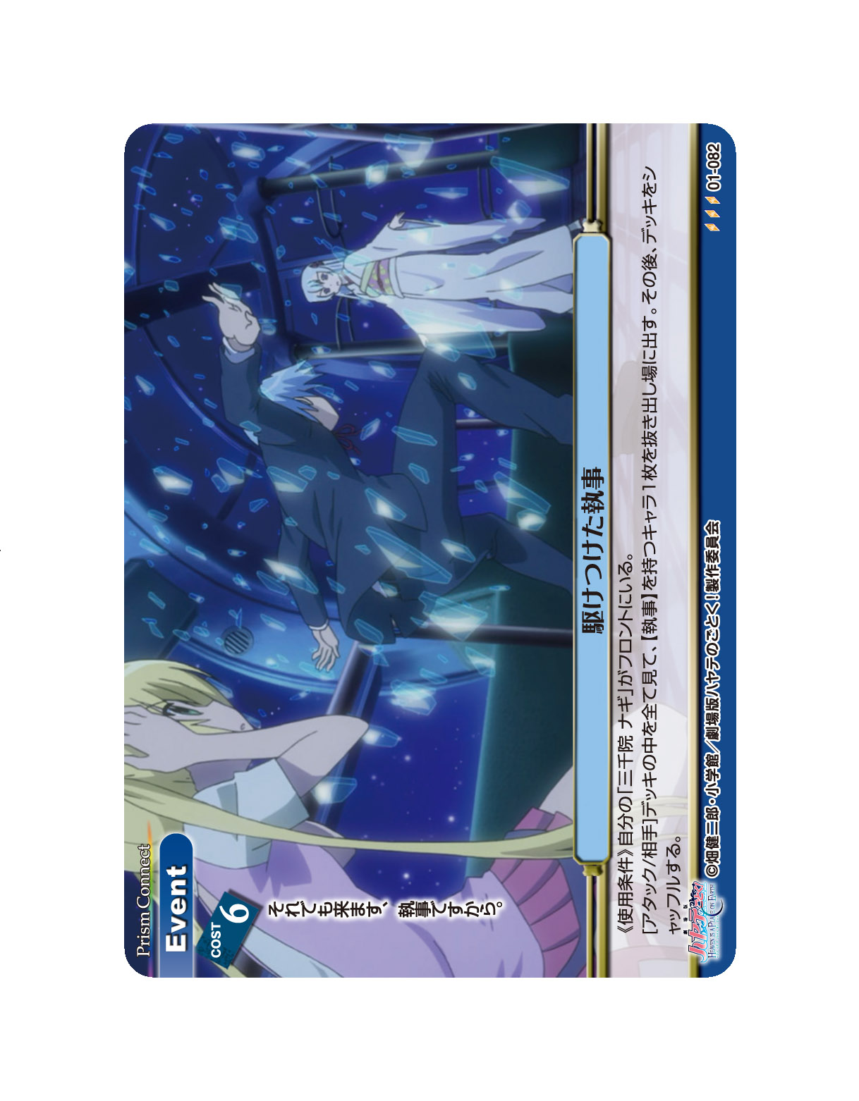 《使用条件》自分の「三千院 ナギ」がフロントにいる。[アタック/相手]デッキの中を全て見て、【執事】を持つキャラ1枚を抜き出し場に出す。その後、デッキをシャッフルする。