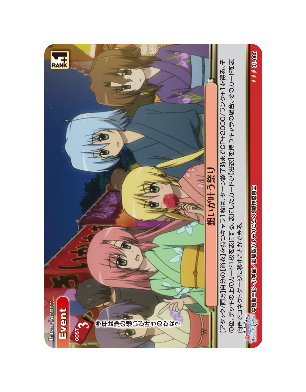 [アタック/両方]自分の【浴衣】を持つキャラ1枚は、ターン終了時までCP+2000/ランク+1を得る。その後、デッキの上のカード1枚を表にする。表にしたカードが【浴衣】を持つキャラの場合、そのカードを表向きでコネクトゲージに移すことができる。
