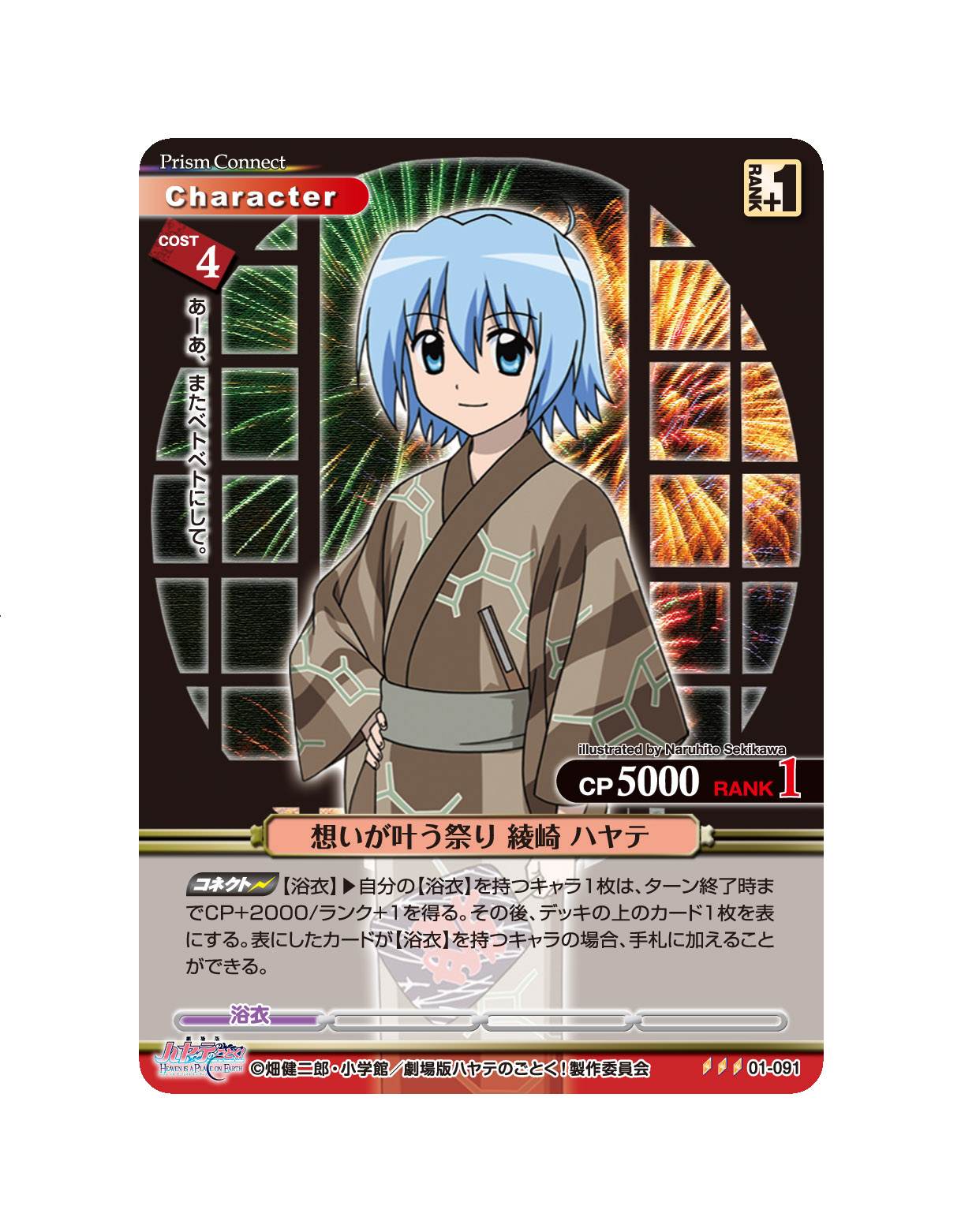 [コネクト【浴衣】]→自分の【浴衣】を持つキャラ1枚は、ターン終了時までCP+2000/ランク+1を得る。その後、デッキの上のカード1枚を表にする。表にしたカードが【浴衣】を持つキャラの場合、手札に加えることができる。