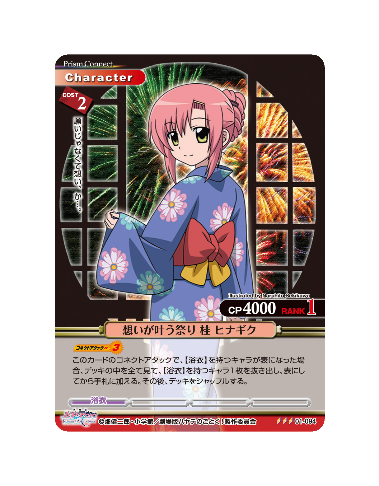 [コネクトアタック(3)]このカードのコネクトアタックで、【浴衣】を持つキャラが表になった場合、デッキの中を全て見て、【浴衣】を持つキャラ1枚を抜き出し、表にしてから手札に加える。その後、デッキをシャッフルする。