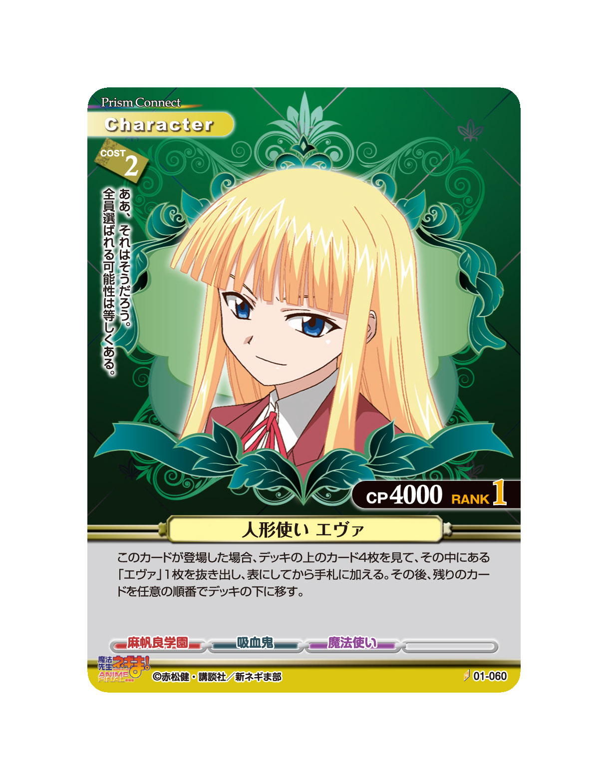 このカードが登場した場合、デッキの上のカード4枚を見て、その中にある「エヴァ」1枚を抜き出し、表にしてから手札に加える。その後、残りのカードを任意の順番でデッキの下に移す。